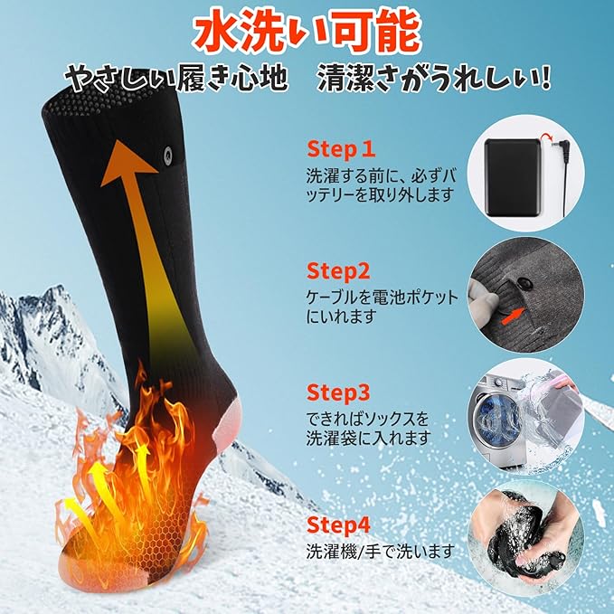 - 電熱ソックスには6000mAhの充電式リチウム電池が内蔵されています。フル充電で4時間から12時間の加熱が可能です。暖かさが長持ちし、デスクワークなどに最適です。 手洗い、洗濯機で洗えるので、長く使えます。(洗濯の際は、必ず電熱ソックスの電池を外してください。洗濯後は自然乾燥させてからご使用ください。)
