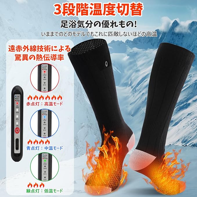 - 電熱ソックスは、柔らかく肌触りの良い高品質な綿を採用しており、着用時に違和感を感じさせません。 保温性、通気性、速乾性、伸縮性に優れていて、足全体を包み込み、抜群の温熱効果を提供することができます。また、電熱機能を使用しなくて、通常の靴下として使用しても人気の商品です。