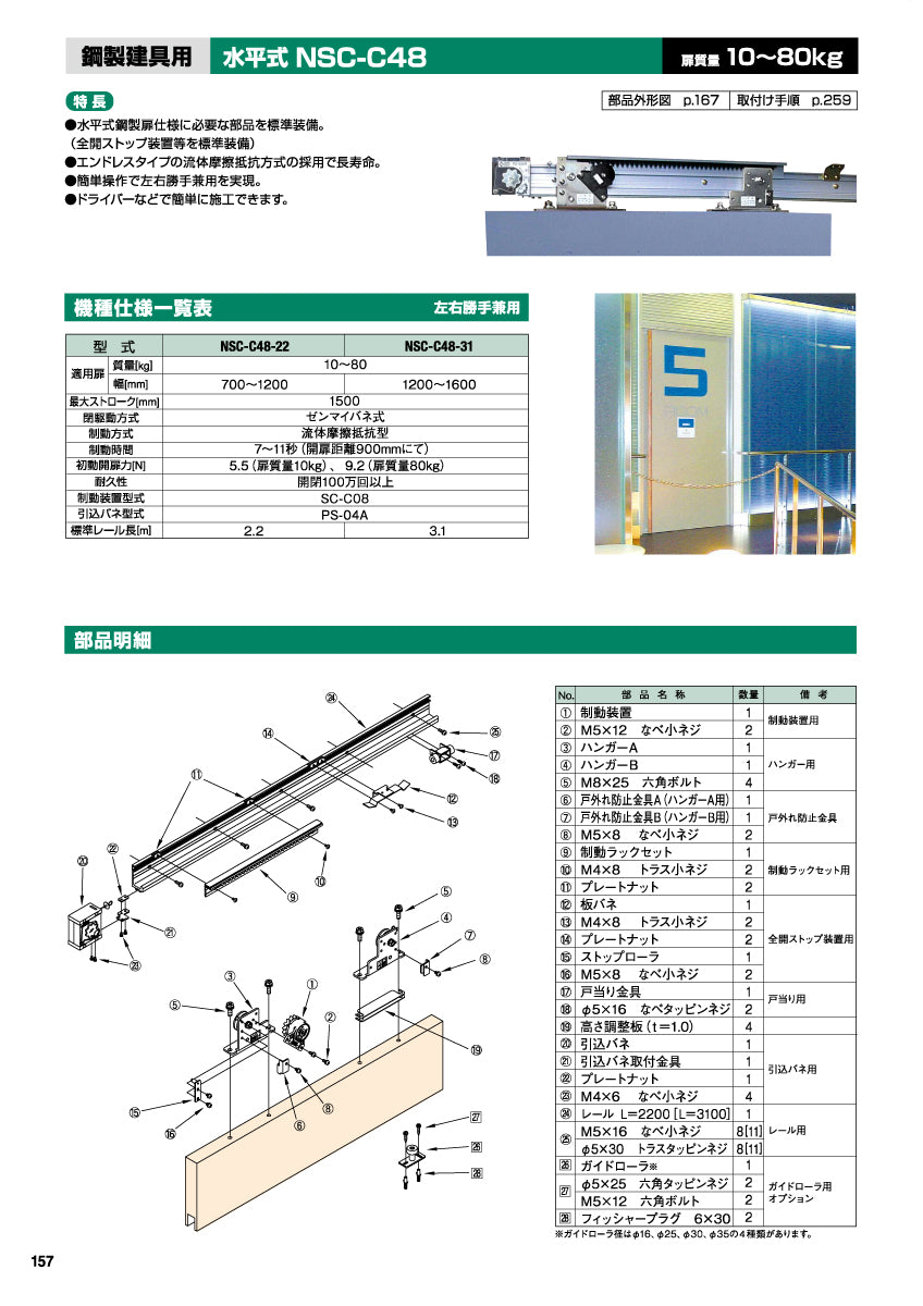 日東工器 スライディングクローザー NSC-C48-22 / NSC-C48-31(製品一式) 【扉重量:10~80kg用, 水平式, 鋼製建具用, 引き戸クローザー, NITTO KOHKI】
