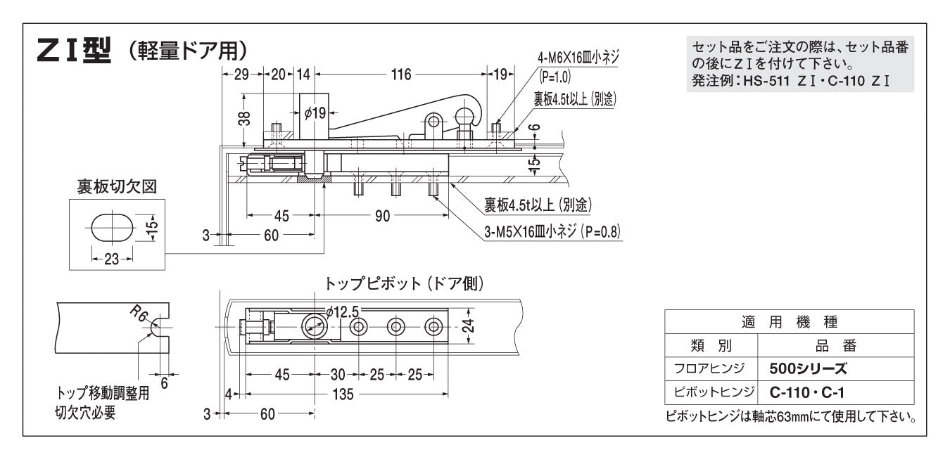 ドア幅方向及び召し合せ調整はドア吊り込み後でも可能。 - ドア上部のトップピボットを移動調整型(ZⅠ型)に変えることで、ドア堅枠の隙間(チリ)をトップピボット側で調整することが可能。(ドア幅方向調整)