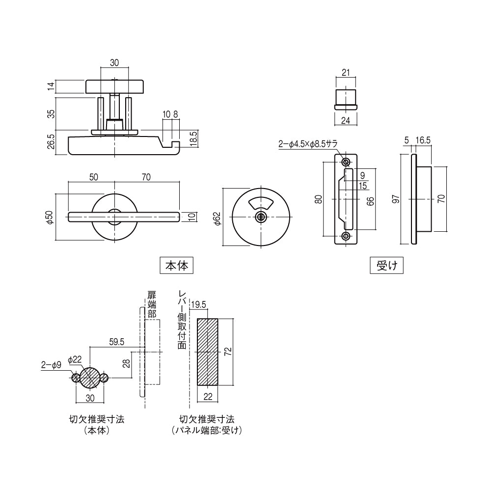 操作側がコンパクトなタイプ。受けはセットに含まれます。 - 適用扉厚